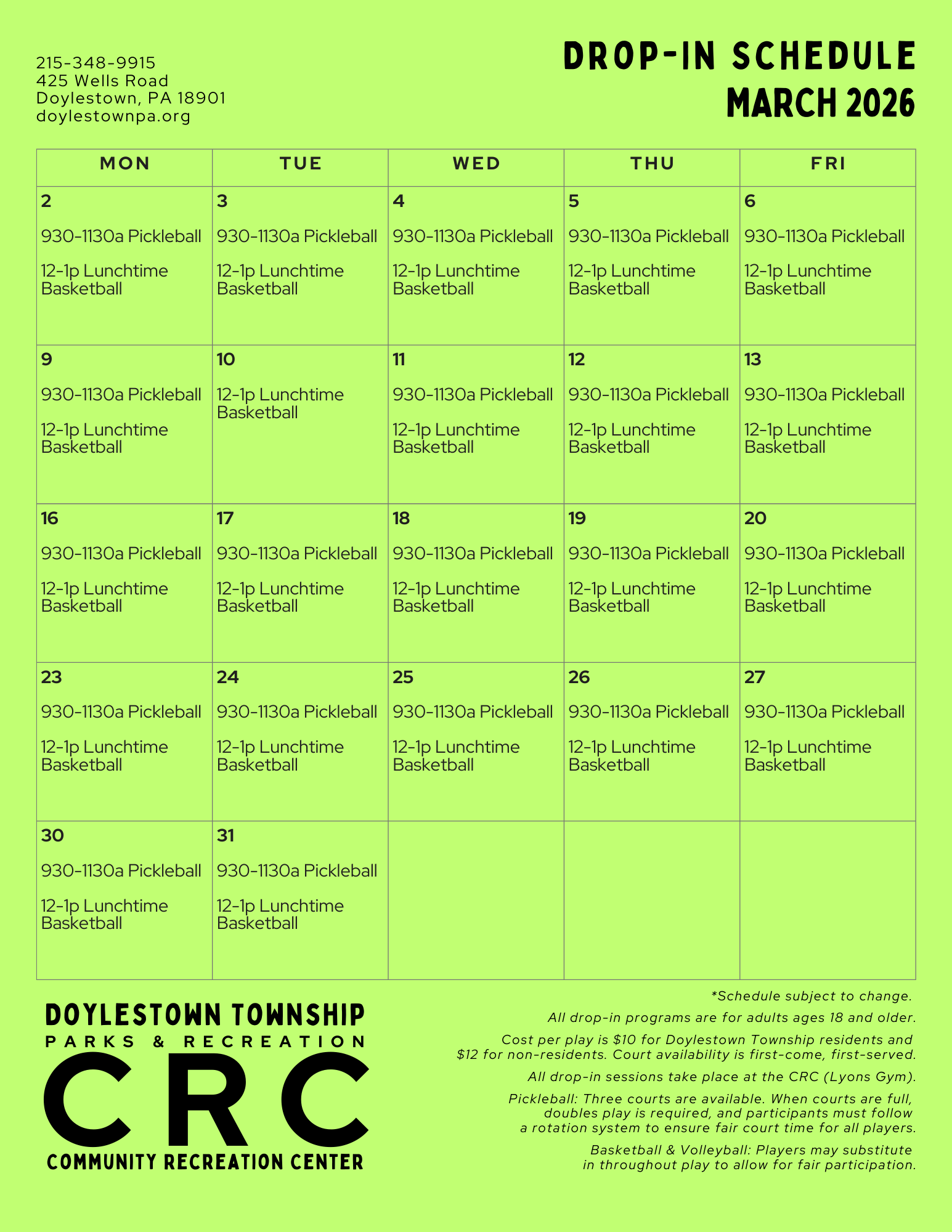 Monthly Drop-In Schedule – Community Recreation Center